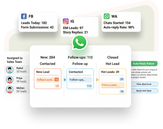 Capture leads instantly from Facebook, Instagram & WhatsApp, auto‑reply within seconds, assign to sales, and turn follow‑ups into conversions — especially built for Real Estate, Agencies & Local Businesses.