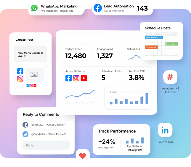 Create with AI, schedule posts, reply to comments, and track performance. Simple plans. Add WhatsApp Marketing or Lead Automation only if you need them.
